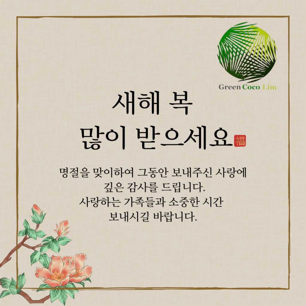 2025년 새해를 맞이하여, Green Cocolim은 고객님과 파트너님, 그리고 모든 임직원분들께 행복과 건강하고를 맞이하여, Green Cocolim은 고객님과 파트너님, 그리고 모든 임직원분들께 행복과 건강하고 풍성한 성취가 가득한 한 해가 되시기를 진심으로 기원합니다. 새해에는 여러분 모두에게 새로운 기회와 행복이 넘쳐나기를 바랍니다.